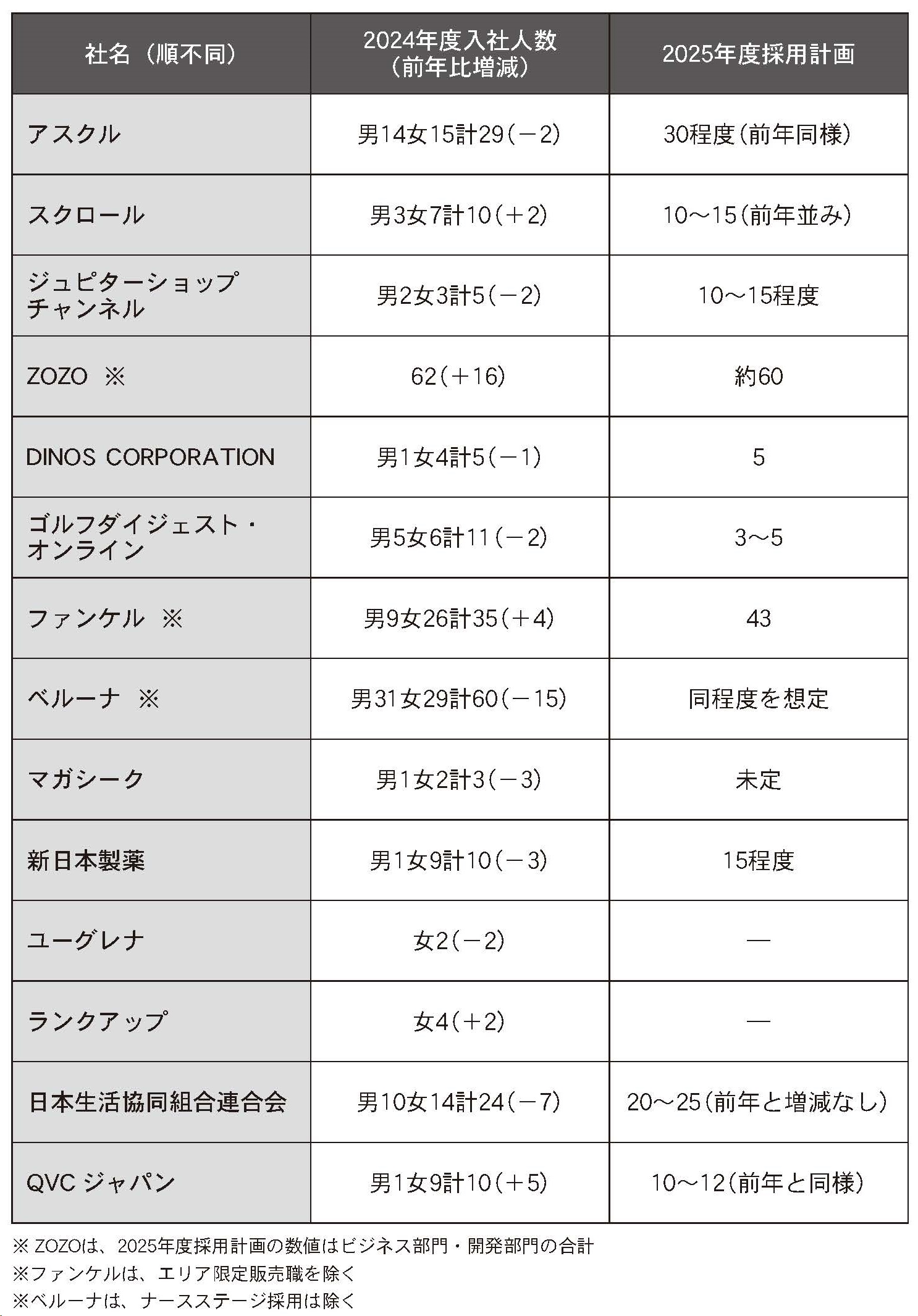 そして、次年度の2025年度採用計画については、回答企業11社のうちほとんどで前年度並みを予定。その内、前年度よりも8人増加予定のファンケルは「研究所の組織編成に伴い、各研究所での募集人数が若干名増えたため」、同約5人増予定の新日本製薬は「経営戦略から人財戦略を検討した結果」、同2~3倍程度の増加予定のジュピターショップチャンネルは「当年度事業計画に合わせた採用人員計画のため」、同6~8人程度減となるゴルフダイジェスト・オンラインは「中期経営計画に基づく採用戦略変更のため」としている。