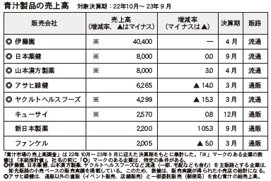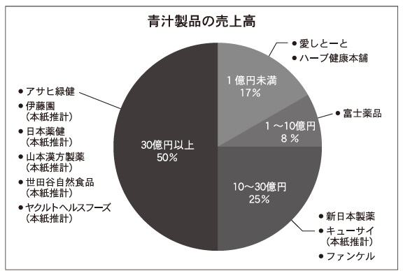 本紙調査で、市場のトップシェアは、「ごくごく飲める」の名称で飲みやすい青汁を展開する伊藤園。通販で「おいしい青汁」を展開する森永製菓も定期顧客数が増加している。今期(24年3月期)は3Qを終えて約23%増で推移。コラーゲンドリンクに続く第2の柱として育成を目指す。