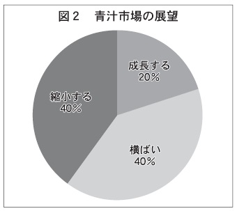 青汁製品の販売状況を聞いたところ、「縮小」(60%)が最も多く、「成長」(30%)、「横ばい」(10%)と続いた(図1)。「縮小」と回答した企業では市場の飽和感を挙げる声が目立つ。