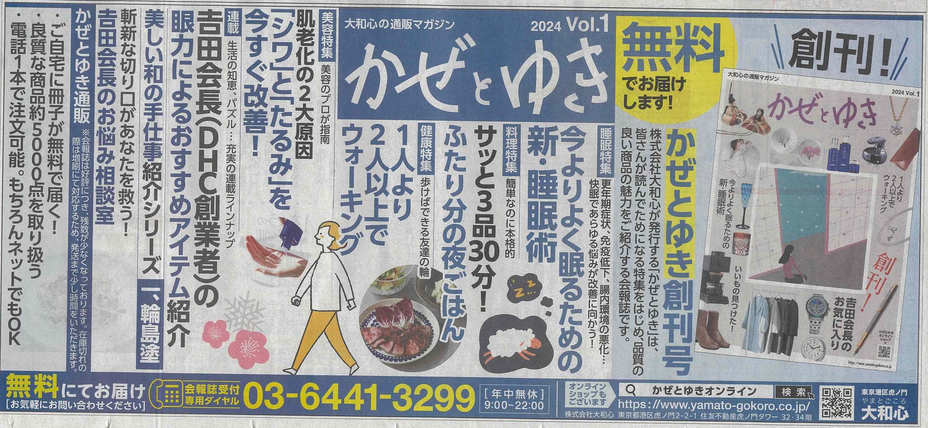4月2日付の読売新聞で、「かぜとゆき」の創刊を広告した。会報誌は無料で配布。「睡眠」「料理」「健康」「美容」で特集企画を展開している。連載企画では、?田会長がおすすめする商品を紹介したり、「斬新な切り口があなたを救う!」といううたい文句で?田会長によるお悩み相談室も企画している。