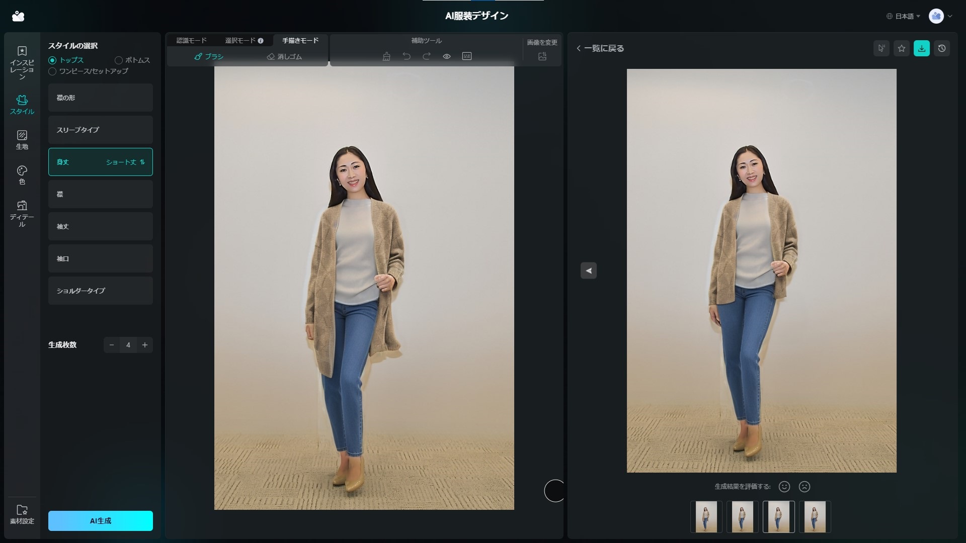 使い方は、画像をユーザーがアップロードし、袖丈や身丈、襟など、変更したい内容を自分で指示していくというもの。指示の内容は、システムの中でクリックして選ぶだけ。例えば画像のジャケットの身丈を変更したい場合は、「スタイルの選択」から「トップス」「身丈」と選び「ショート丈」を選択。「どのくらい短くするか」をマウスで範囲指定し、マスクする。あとはAIがジャケットの身丈を短くした画像を、数秒で4パターン生成してくれるので、イメージに近い画像を選ぶだけ。生成された画像のフィードバックを送信することで、精度を高めていくことも可能だ。
