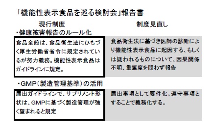 機能性表示食品制度は、健康被害報告やGMP(製造管理基準)の義務化で、安全性や品質を担保する。健康被害報告は、「医師の診断」で機能性表示食品に起因、もしくは疑いがあるものについて、「症状の重篤度」や「因果関係不明」を含め報告を求める。食品表示基準など内閣府令等による対応を前提にするが、将来的に法令による対応を想定。義務化は、これまでの「ガイドライン行政」から法令に基づく行政への転換を視野にいれる。