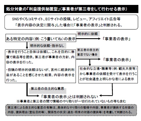 「利益提供秘匿型」は、「第三者の意志」が評価を左右する。第三者との「具体的なやり取りの内容」、「対価の内容」、「提供理由(宣伝目的等)」「両者の関係性」から、事業者による関与を評価。明示的な依頼がなくても表示内容を決定できる程度の関係性があれば「事業者の表示」になる。ただ、「第三者の自主的な意思」による表示であれば規制対象にならない。日本に根付く贈答文化など、あらゆる物品等の提供が”対価”と取られないようにした。