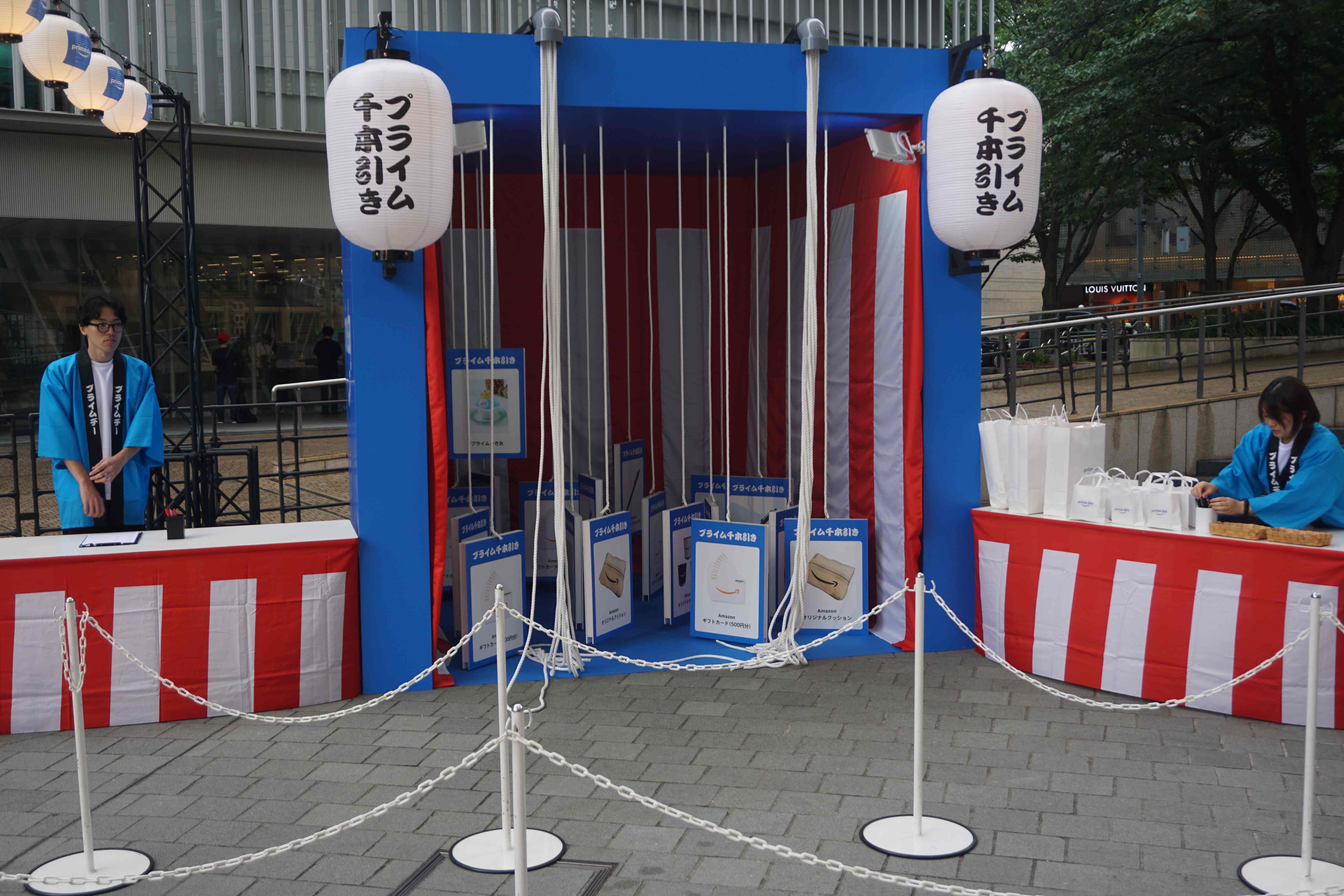 賞品は「500円分のAmazonギフト券」のほか、オリジナルのクッションやタンブラー、アマゾンのプライベートブランドのボールペン、また、縁日にちなんで会場の露店で提供されるアマゾンが展開中の生鮮食品などのECサービス「アマゾンフレッシュ」で販売するバナナを使った「プライムデー」のロゴが入ったマショマロをあしらった青く着色されたチョコバナナやかき氷から1つを贈与する。紐を引くことで反対側についた賞品のパネルが引っ張りあがる大型くじ引き「プライム千本引き」で賞品が決定する。