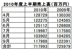 日本通信販売協会(JADMA=事務局・東京都中央区、宮島和美会長)の売上高月次調査集計によると、対象約130社の2010年度上半期(4~9月)の総売上高は前年度同期比1・1%減の7179億9300万円となった(表参照)。健康食品を除いた「食料品」や文具・事務用品、化粧品を除いた「雑貨」などが前年度を大きく上回ったものの、「家庭用品」や「通信教育・サービス」「衣料品」の不調が響き、全体では前年度同期比で微減となった。