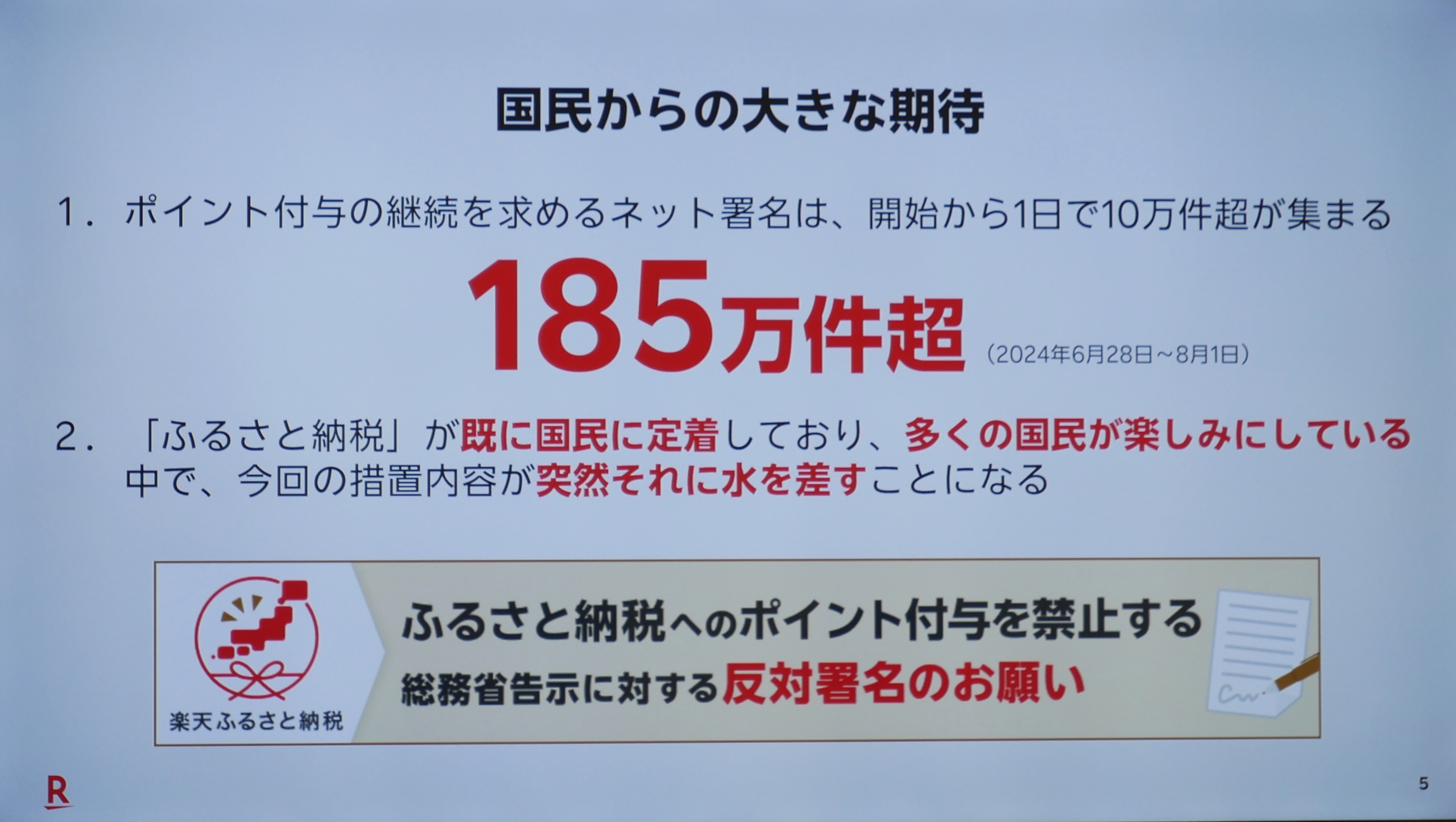 楽天グループは8月2日、総務省が「ふるさと納税ポータルサイトにおけるポイント付与」を禁止する告示をしたことに関し、反対の意思表明と撤回を要求する記者会見を都内で開催した。武田和徳取締役副社長執行役員は「ふるさと納税はすでに国民に定着しており、多くの国民が楽しみにしている中で、今回の措置は水を差す内容になっている」と総務省を非難。その上で「ポイントがふるさと納税を利用するきっかけになれば、今後の地域活性化にも繋がる」と、ポイント付与の継続を訴えた。