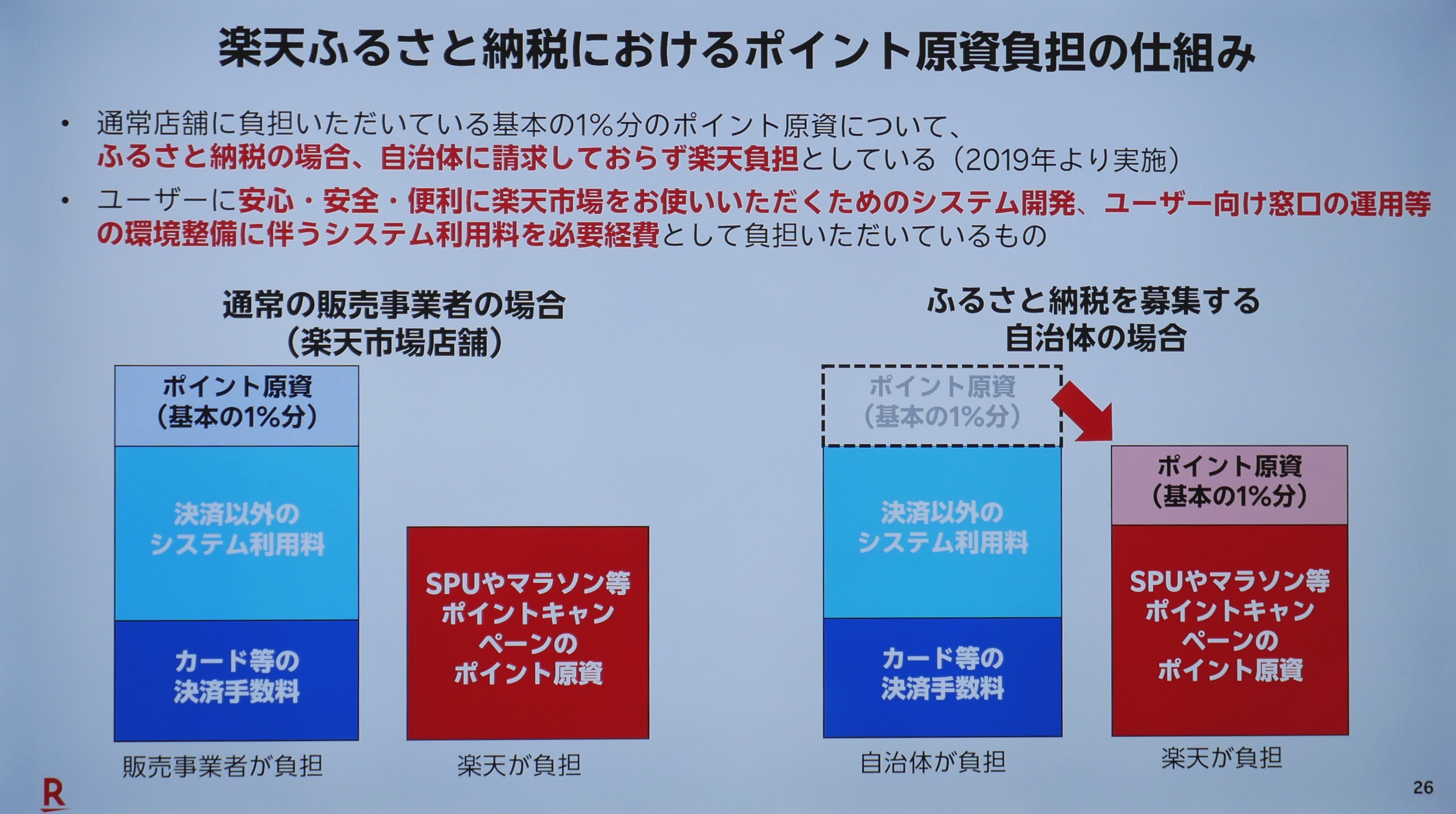 記者会見では、総務省が打ち出した「ポイント付与禁止」に対し、「地方自治体と民間企業の連携体制がうまくいっているのに、これを否定するものだ」(関聡司執行役員渉外室長)と批判。同サイトで寄付者に付与しているポイント原資は同社が負担しており、楽天市場において出店する全店舗が支払っている、基本1%分のポイントについても自治体に請求していないという。