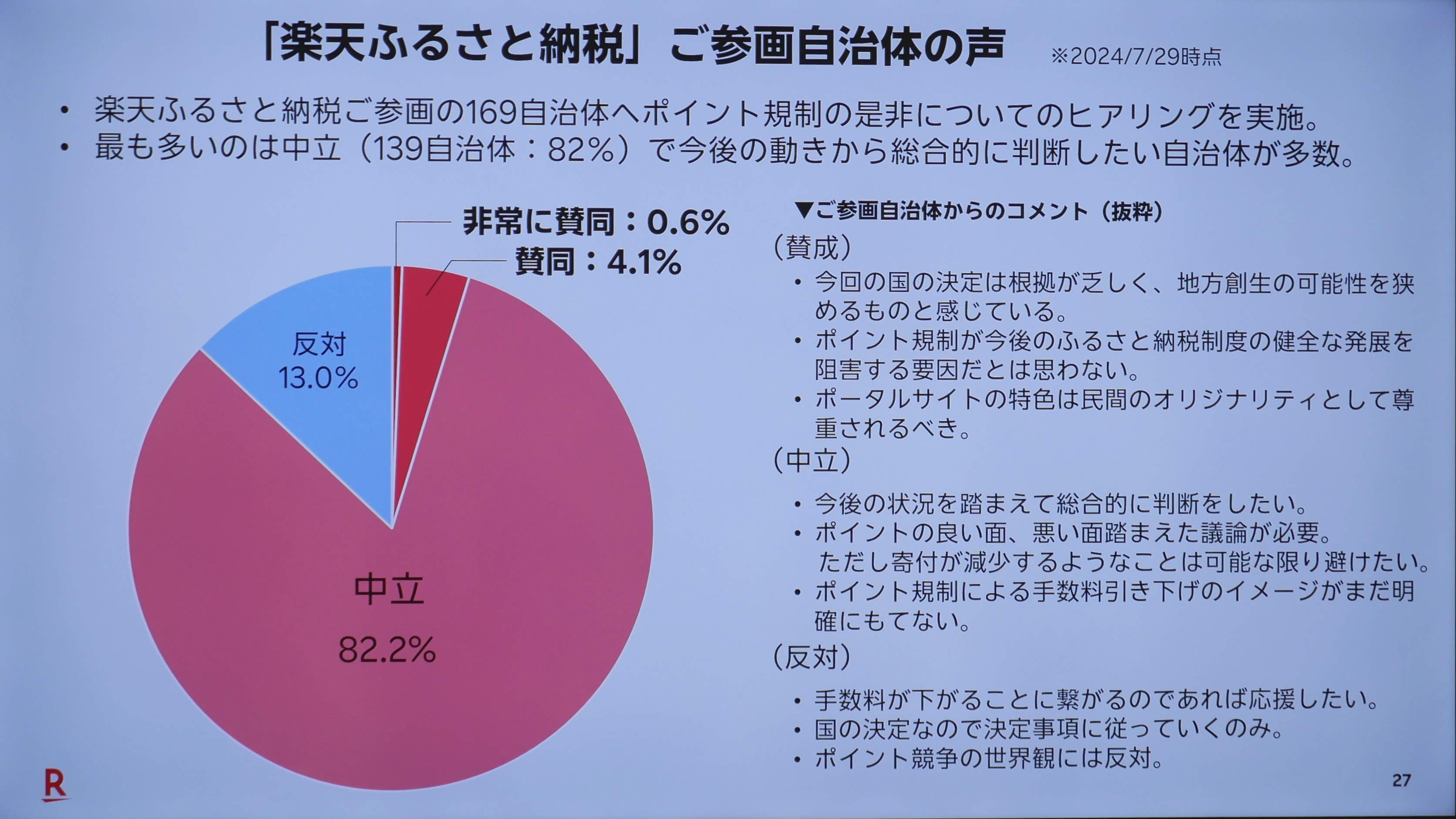 木村上級執行役員「地方自治体はふるさと納税だけをやっているわけではなく、総務省とは他にもいろいろなやり取りがある、という中での回答だ。自治体からの意見を分類するとこの3つになるが、中立の意見の中でも、賛成に近いものもあれば反対に近いものもある。ただ、多くの自治体は態度を保留していることは分かる。また『手数料が下がるならポイント禁止に賛成』という意見もあるが、そこは当社としては論点にしていない」