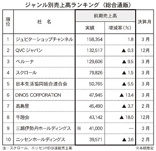 テレビや紙媒体での総合通販(インターネット通販専業除く)を展開する通販事業者のうち、売上高上位10社を抜粋した。その中から注目すべき各社の前期の状況を見ていく。