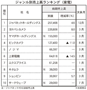 主に家電を販売する小売り企業(メーカー直販やパソコン専門は除く)を売上高順に10位まで抜粋した。