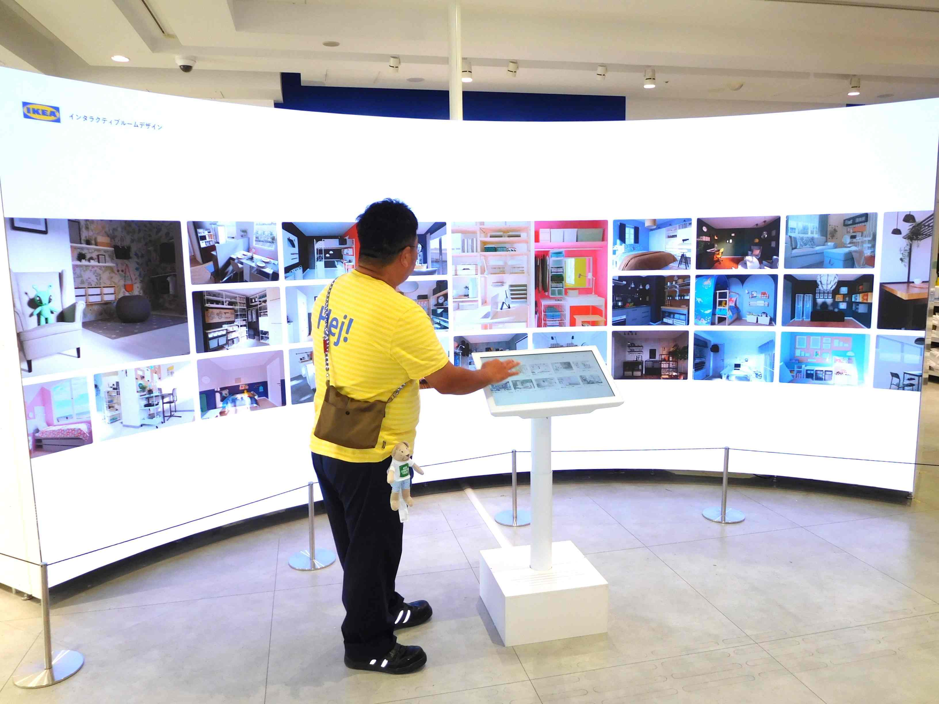 そして、オムニチャネルに向けた目玉企画としては、大型スクリーンによる「インテリアスタイルラボ」を導入。LEDを搭載したカーブ型の大型スクリーンとなっており、同社のインテリアデザイナーによって、日本の家での暮らしのニーズをもとにつくられた約50種類の部屋のバーチャル画面が閲覧できるようになっている。手元のパネルで360度自由に動かすことができ、スクリーン上の表示商品は、二次元コードをスキャンすることで、通販サイトから購入ができる。
