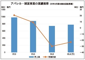 アパレル・雑貨事業の2024年3月期業績は、売上高が前期比15・9%減の742億5100万円、セグメント損益は29億9200万円の赤字と不振だった。安野清社長は「用紙代と印刷費の上昇、さらには急激な円安による仕入れ価格上上昇の影響を受けた。一方で最終価格への転嫁は難度が高い。結局のところ、値上げを我慢したアパレル小売り企業が勝っているわけで、そういう意味では、構造的に収益が上がらない事業になってしまっている」と渋面を作る。
