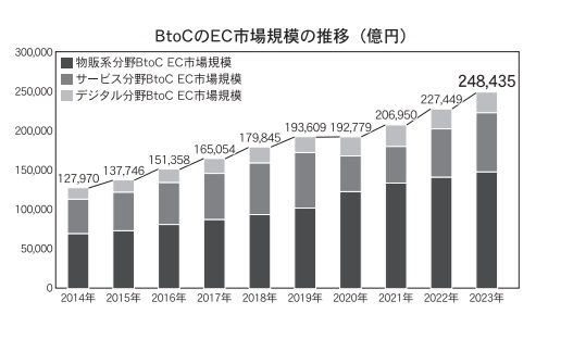 なお、CtoCのEC市場規模については、個人間の取り引きが急速に拡大していることを踏まえて同5.0%増の2兆4817億円と推計している。