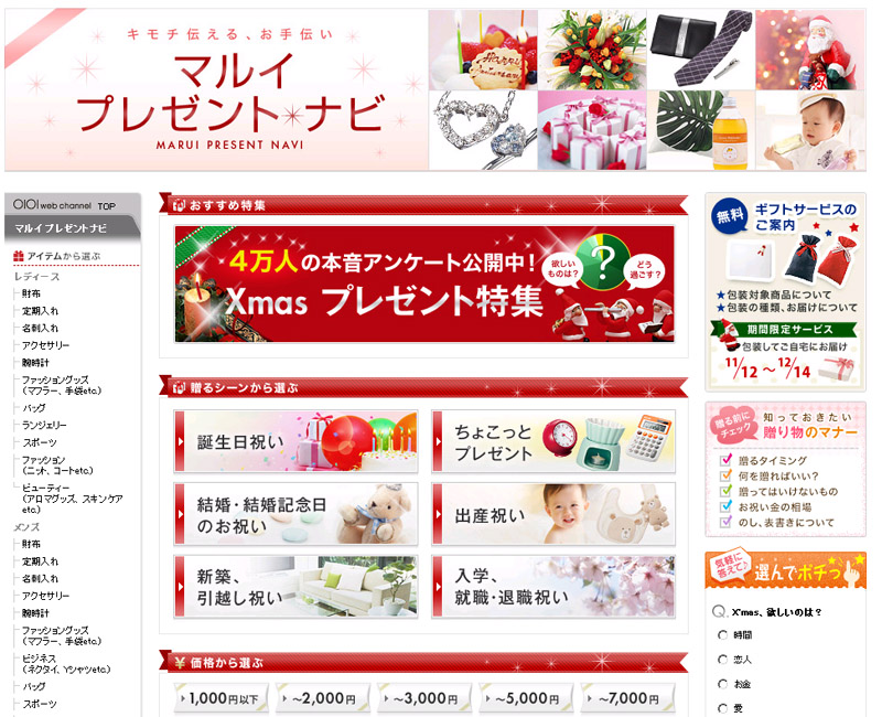 コンテンツ面では今年11月中旬、通販サイト内にギフト商材の購入を手助けするコンテンツ「マルイプレゼントナビ」を新設(画像)。シーン別や相手の属性、価格帯、ブランド別などでギフトを選べるほか、贈り物のマナーを発信するコーナーを設けて、主力顧客の若年層の参考となるようにした。