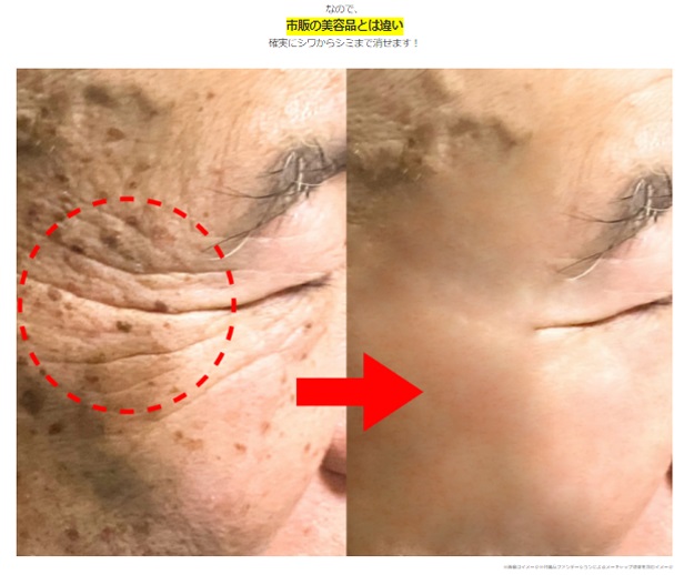 同社は5月22日から7月2日まで、美容クリーム「ケシミシワ」の広告で「塗って速攻?深いシワも完全消滅!!」、「塗ると速攻顔中のシワが完全に消えた!」などの文言を表示。顔面にクリームを塗ってなでるような動作をすると即座にしわが消えたかのような動画や、商品の使用前後の状況を対比したような画像(=消費者庁発表の資料より)を表示していた。