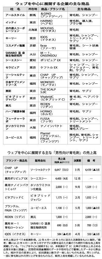 ホソカワミクロンは今年10月、商品開発やマーケティングの最適化、事業運営の効率化・加速化を目的に、育毛剤等を通販するホソカワミクロン化粧品を吸収合併した。広告露出はまだ少ないとみられるが、ヘルスケア領域で強みを持つハーブ健康本舗も育毛剤通販に参入している。