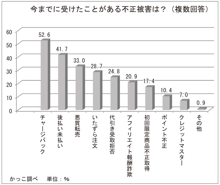 また、「今まで受けたことがある不正被害(複数回答)」については、「チャージバック(クレジットカード不正利用)」が最多の52.6%で、「後払い未払い」(41.7%)、「悪質転売」(33.0%)、「いたずら注文」(28.7%)、「代引き受取拒否」(24.8%)などと続いた(図表を参照)。