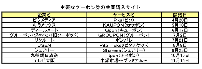 8月には本家である米グルーポン社が日本に上陸。同業のクーポッドを買収し日本でビジネスを展開。その後もテレビ局の参入などがあり、現在のところ参加企業は増加する勢いを見せる。