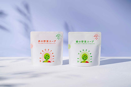 第1弾商品はスープ2アイテムを展開する。「赤の野菜スープ」はにんじんやかぼちゃ、とうもろこし、トマトなど7種類の野菜を、「緑の野菜スープ」はキャベツや小松菜、ホウレンソウ、ねぎなど9種類の野菜をそれぞれ使用した。定期購入で取り扱い、初回は16食入で税込価格4980円(送料880円)。