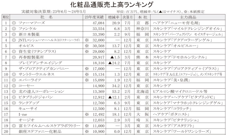 市場は横ばい推移〈23年度化粧品通販売上高〉上位90社総計、6446億円 0・4%増、外部ECに顧客接点