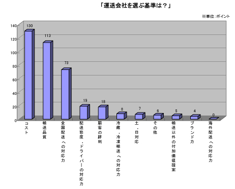 一方、「運送会社を選ぶ基準」については、重要な順に3項目を選んでもらい、これをポイント化して集計したところ、「コスト」が130ポイントと最も多く、全体としては景気低迷を反映する向きが根強いものの、「輸送品質」が113ポイントに上ったほか、「全国配送への対応力」も73ポイントとなり、通販実施企業が重視していることが分かった(