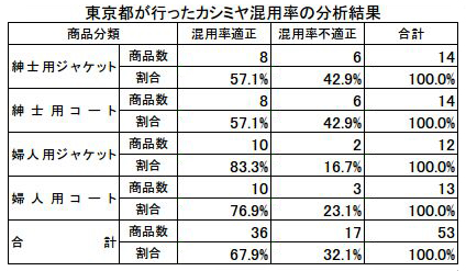 東京都では昨年7月から11月にかけ、生活安全課がネット販売で購入したカシミヤ製のジャケット・コート類53品目(価格5208~5万9850円)の商品テストを実施。このうち32・1%に当たる17品目で、カシミヤ100%とうたいながら実際の混用率極めてない少ないなどの不適正な表示が見つかった。