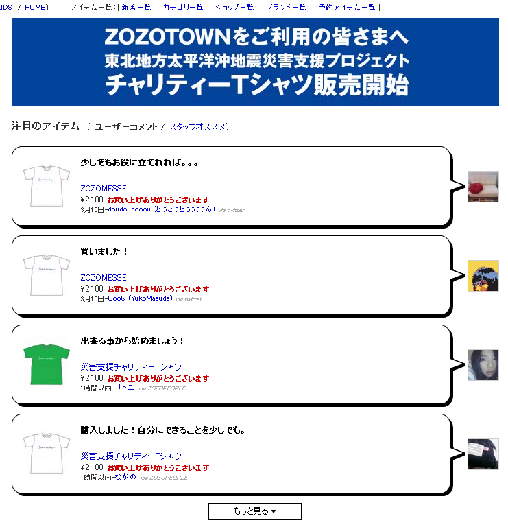 スタートトゥデイが3月15日から予約販売を始めた震災支援のチャリティーTシャツが、開始48時間で7万5000枚を受注し、注目を集めている。同社の通販サイト「ゾゾタウン」では3カ月ほど前のリニューアルでツイッターを通じたコメント投稿が可能になり、購入者の反応がリアルタイムでトップページに掲載されるなど、くちコミによって情報が拡散したことも、驚異的な受注件数につながっている要因のひとつといえそうだ。
